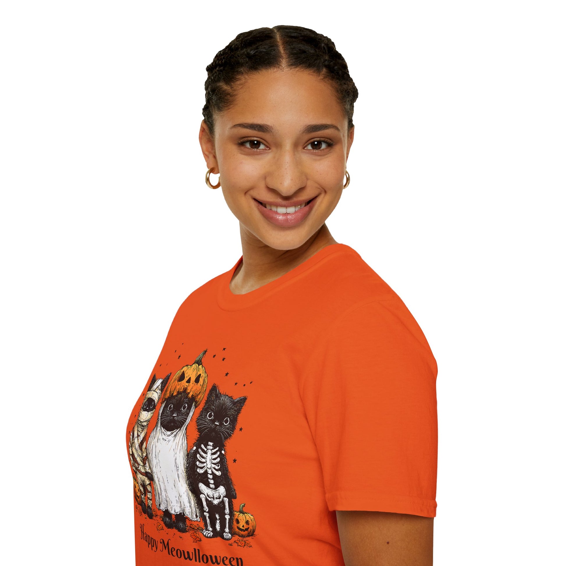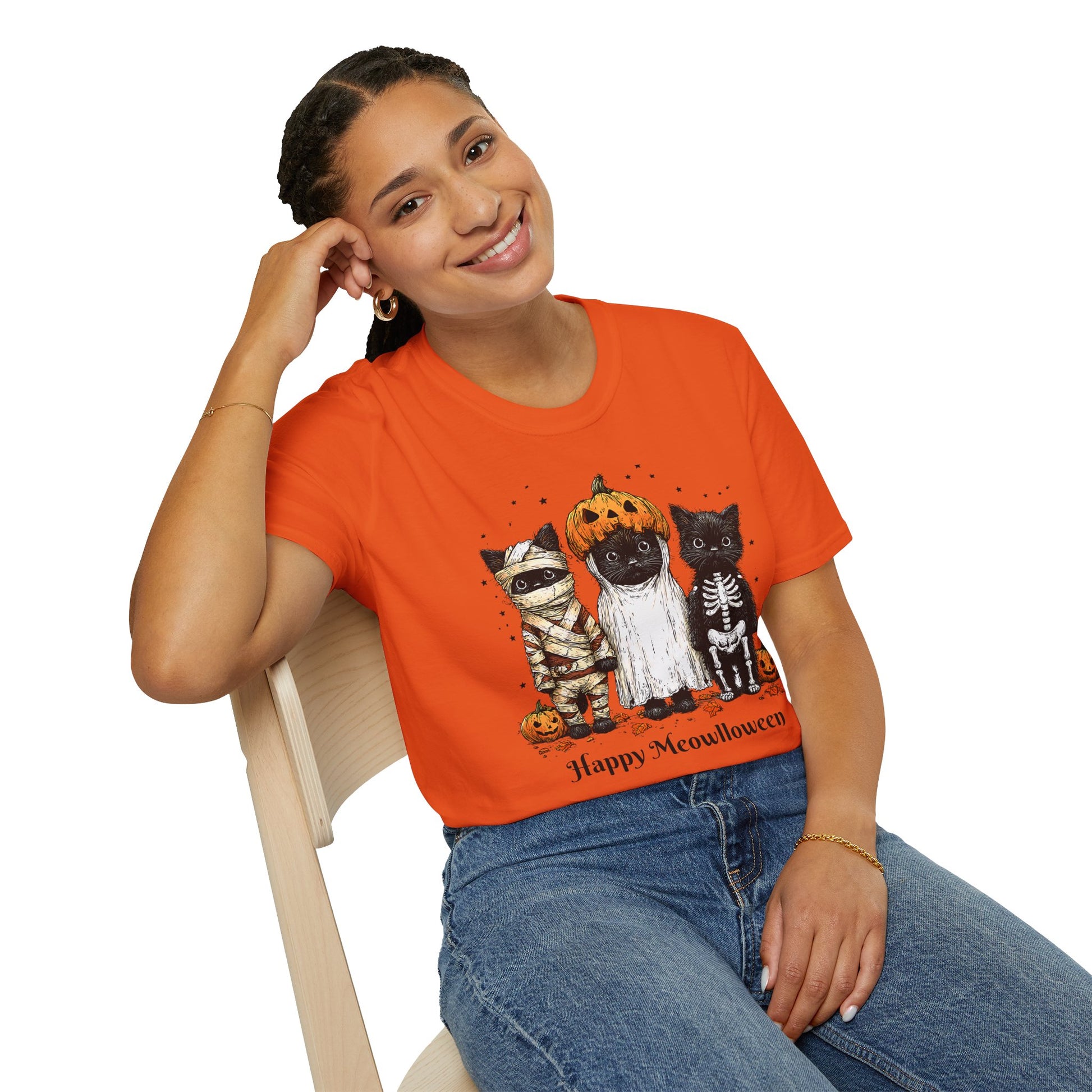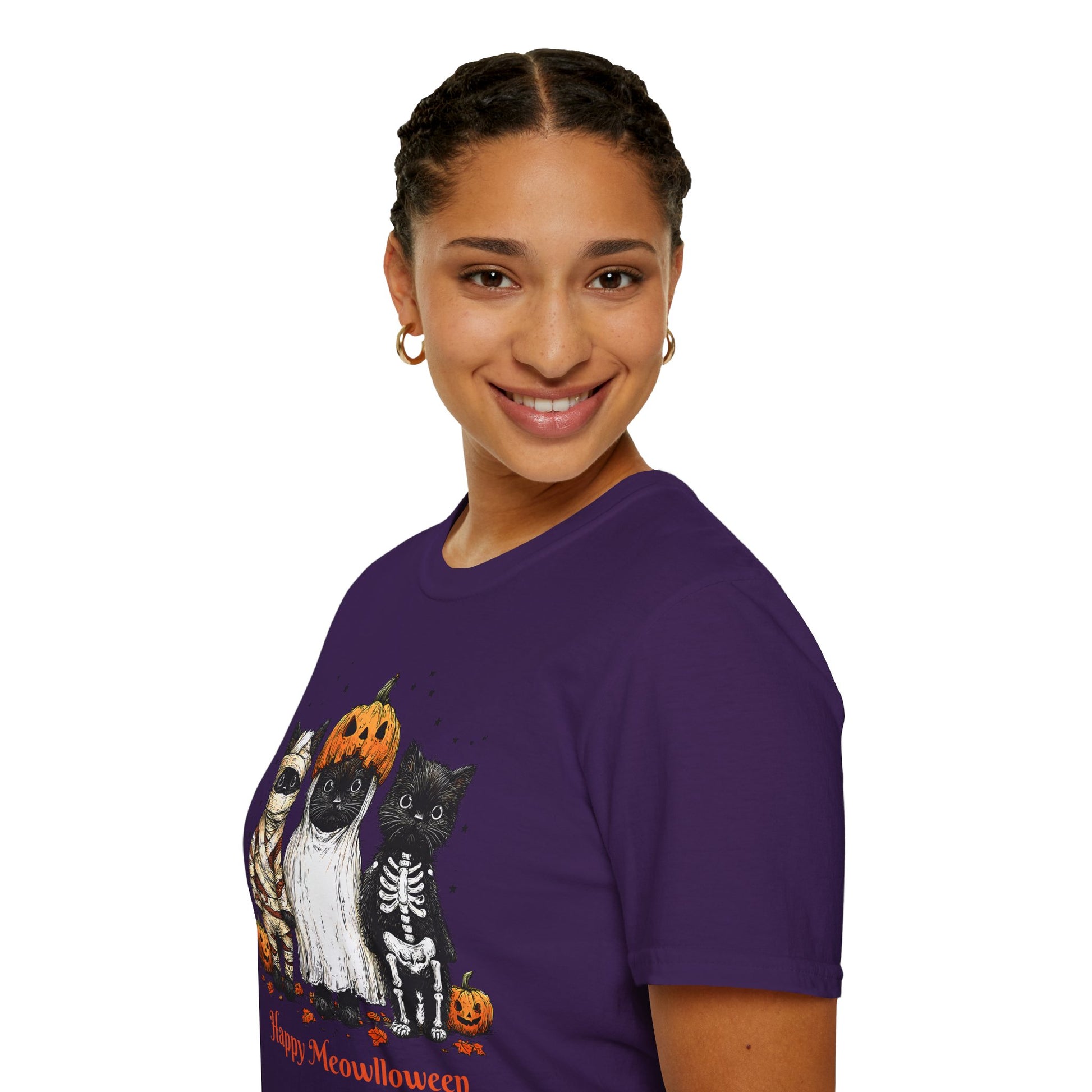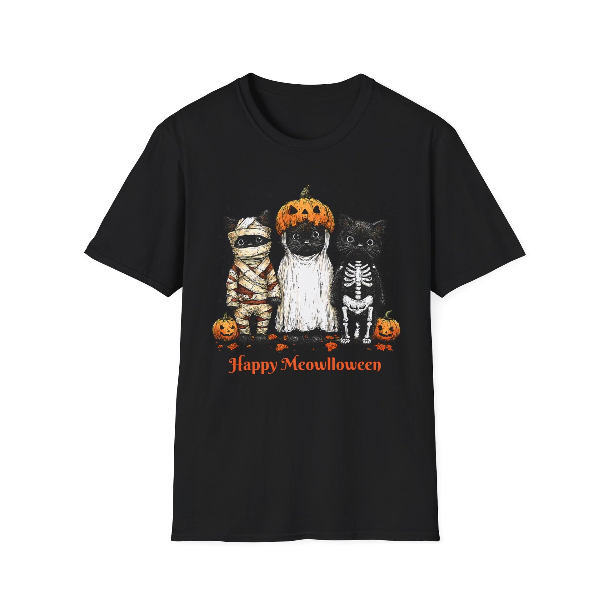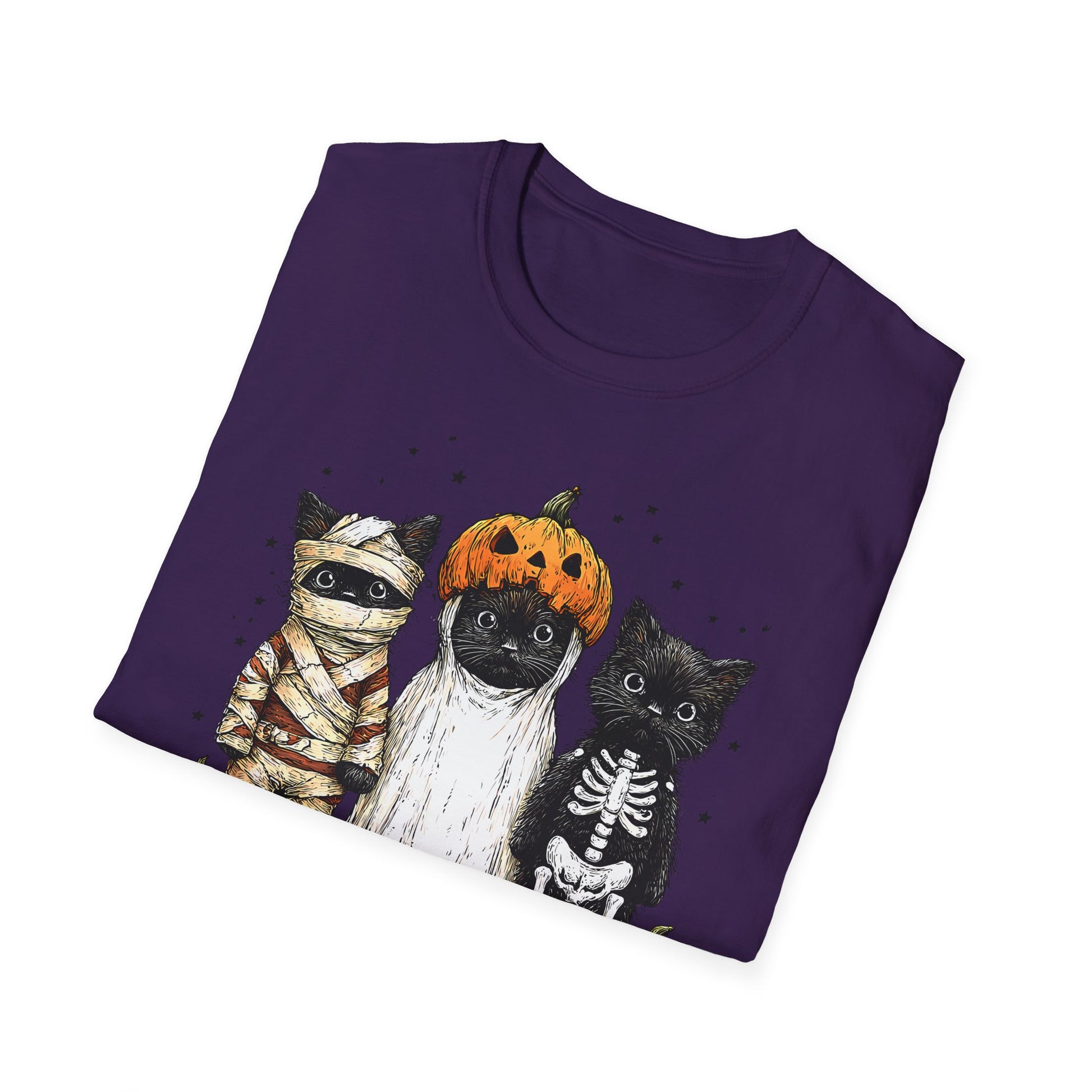 Introducing the perfect addition to your autumn wardrobe: a playful Unisex Softstyle T-Shirt designed to embrace the spirit of Halloween. Featuring original graphic-printed cats dressed in fun costumes, this shirt brings a lighthearted vibe that resonates with cat lovers and Halloween enthusiasts.