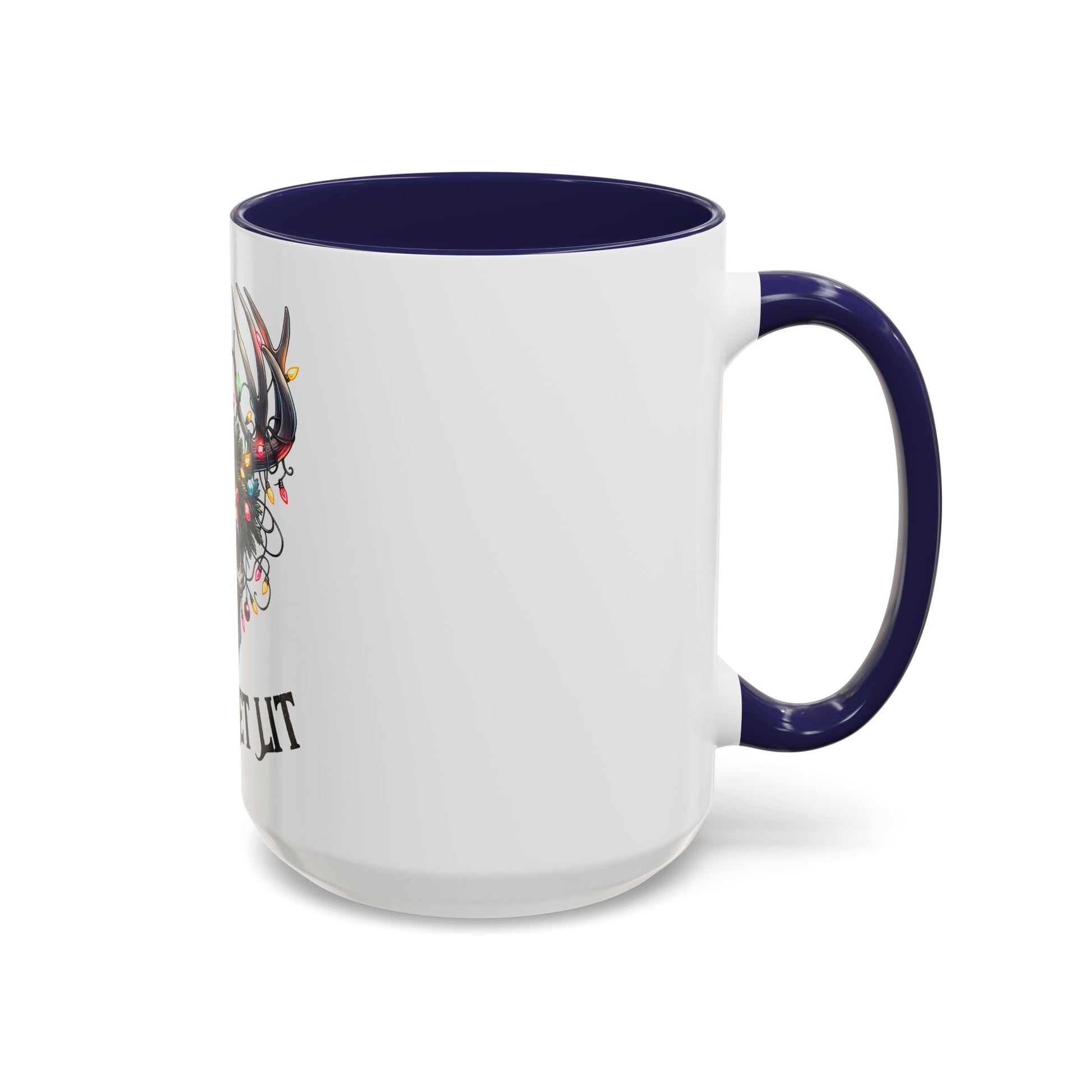 This ceramic Accent Coffee Mug brings a bold, playful edge to every morning ritual. The white gloss exterior showcases a striking skull-with-antlers illustration wrapped in colorful holiday lights, paired with the cheeky line “LET’S GET LIT.” A colored interior and matching C-handle add eye-catching contrast while the glossy finish keeps the artwork bright. It’s the kind of mug that sparks laughs at late-night chats, sets a rowdy mood at gatherings, or becomes the go-to cup for anyone who loves dark-humor seasonal decor.