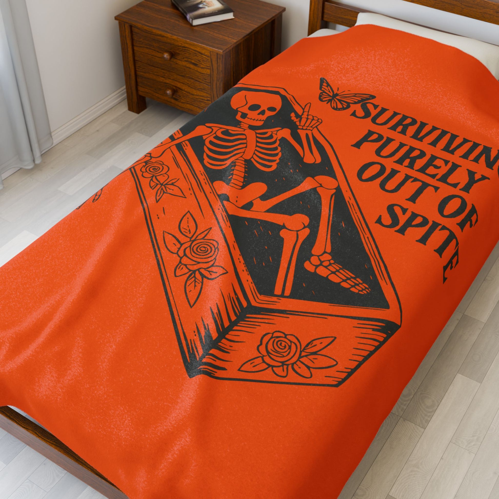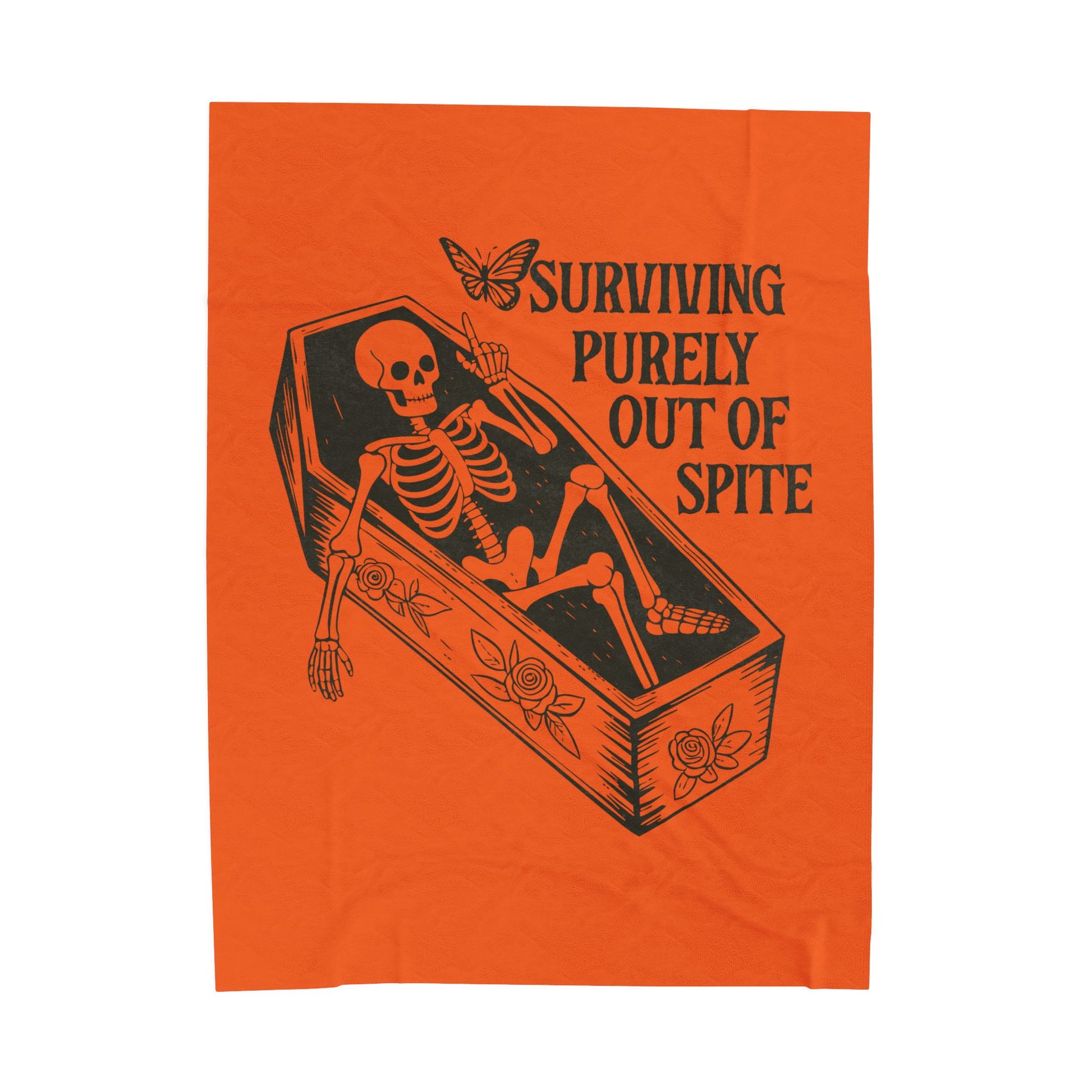 Cozy up with this year around velveteen plush blanket featuring a funny quote 'Surviving out of spite.' This blanket gives off a cozy and humorous vibe, perfect for snuggling on the couch or adding some warmth to your bed. Ideal for adults looking for a soft and durable blanket to stay comfortable during any season. Great for gifting on birthdays, holidays, or just because.